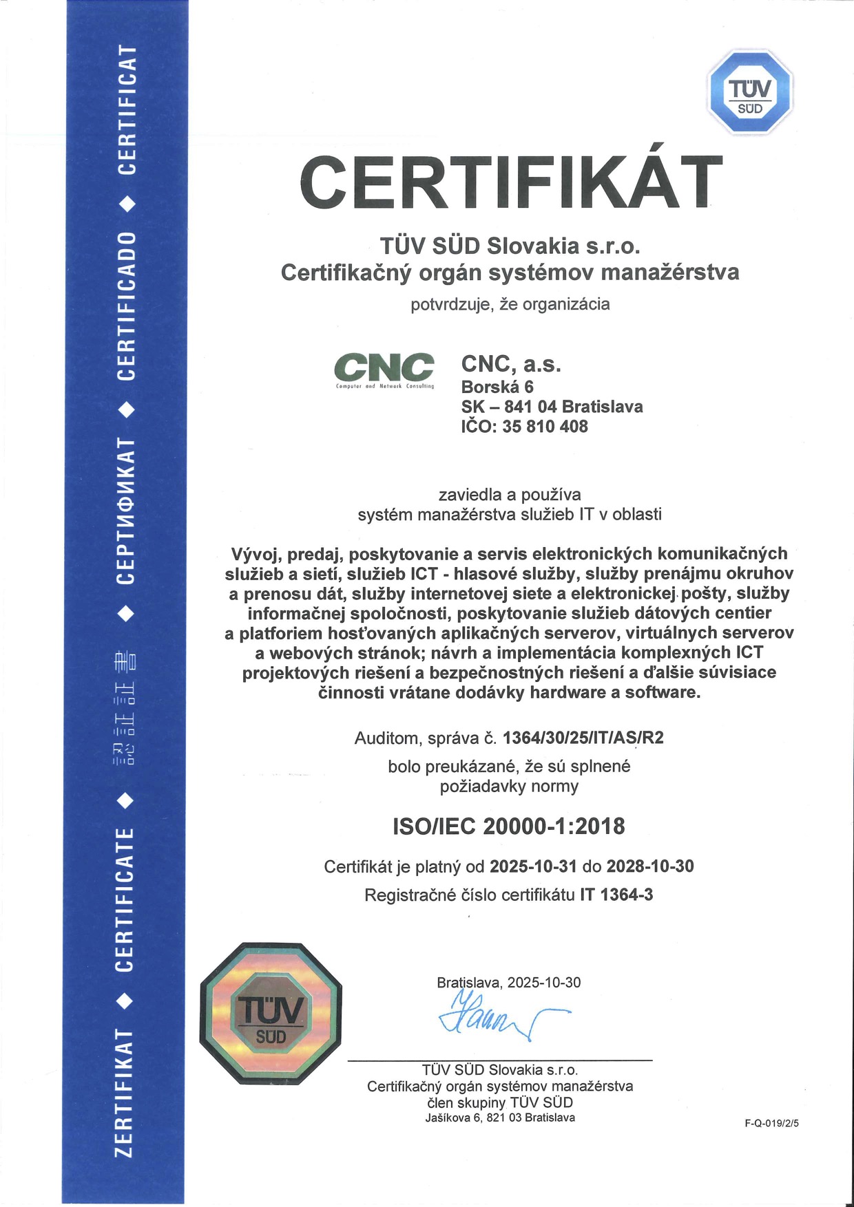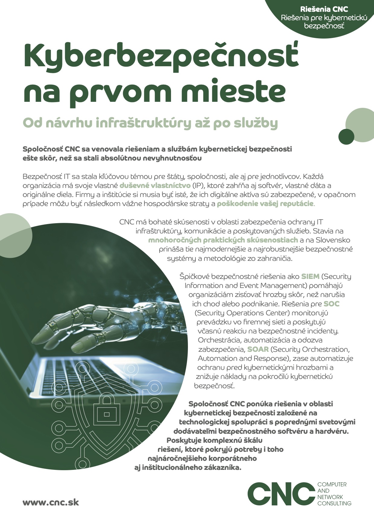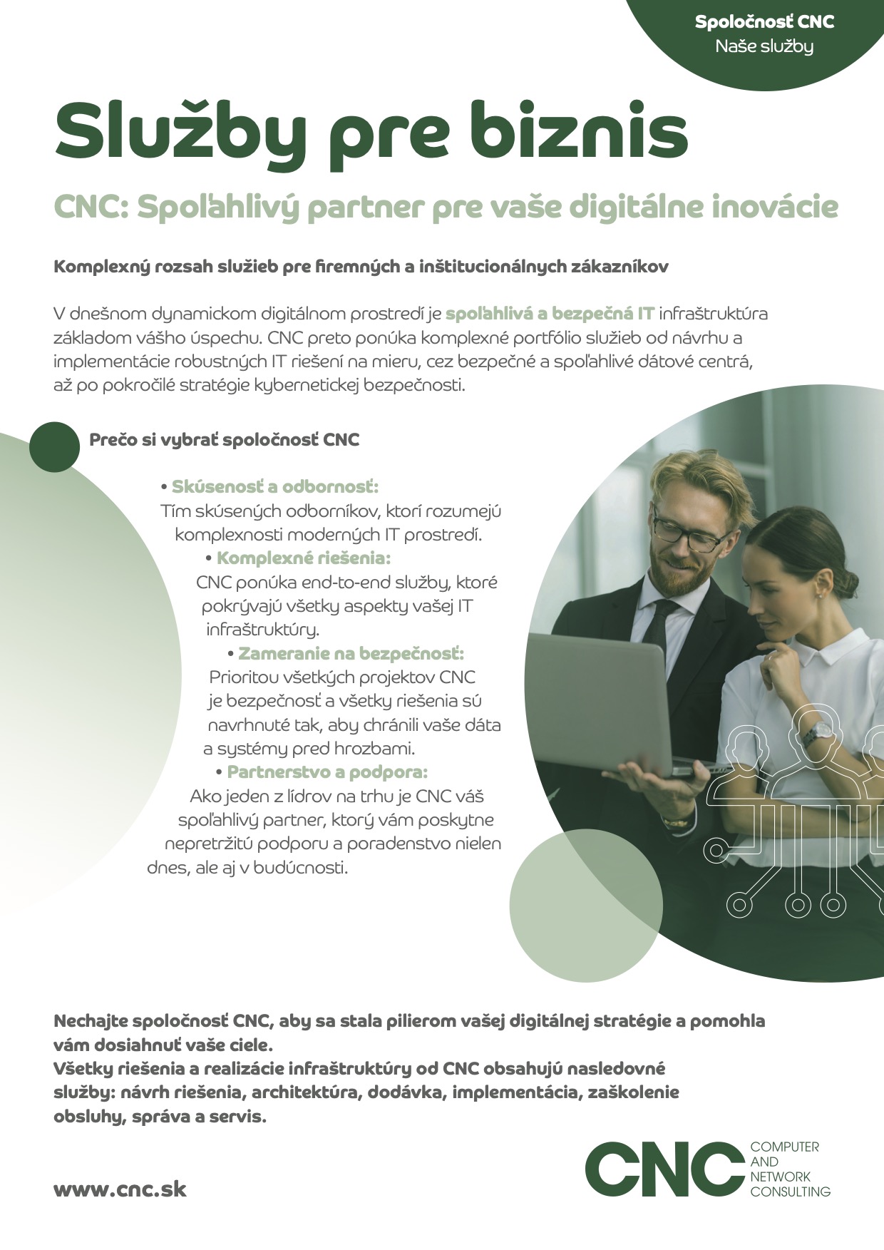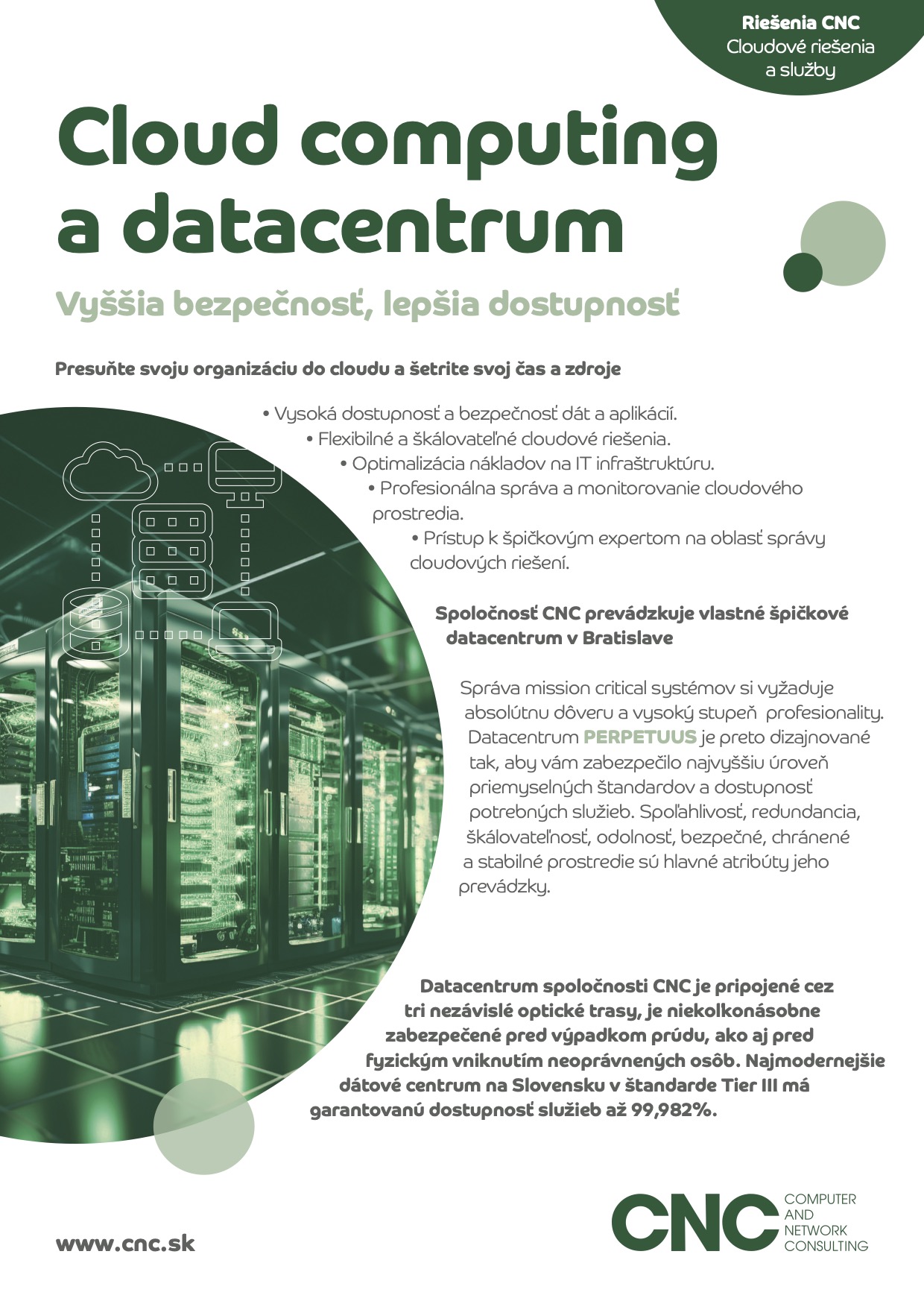 CNC navrhuje, dodáva a spravuje komplexnú IT infraštruktúru na mieru, ktorá je vždy optimalizovaná pre špecifický biznis. Služby zahŕňajú správu a servis serverov, správu operačných, databázových a aplikačných systémov, dátových úložísk a celej sieťovej infraštruktúry. Patria sem technológie ako LAN/WAN, SAN, VPN, privátny cloud – hybridný cloud, ako aj monitoring.